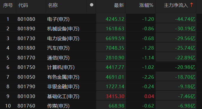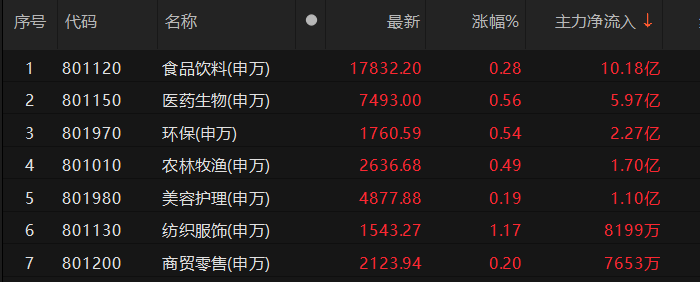 截至5月27日13时43分,申万一级行业板块中,主力资金净流入食品饮料、医药生物、环保等板块,其中,食品饮料板块净流入超10亿元。主力资金净流出电子、机械设备、电力设备等板块,其中,电子板块净流出超44亿元。
