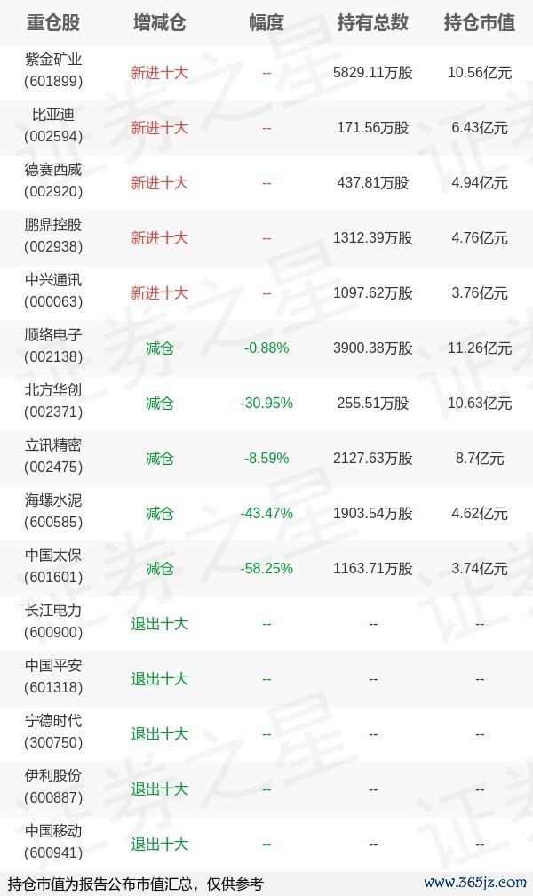 本站消息,4月22日兴证全球基金旗下董理管理的兴全趋势投资混合型基金公布一季报,近1年净值增长率-0.15%。与上一季度相比,该基金前十大重仓股新增紫金矿业扬帆证券,比亚迪,德赛西威,鹏鼎控股,中兴通讯;其中顺络电子持仓占比8.16%,为该基金第一大重仓股;长江电力,中国平安,宁德时代,伊利股份,中国移动等退出前十大重仓股;详细数据如下: