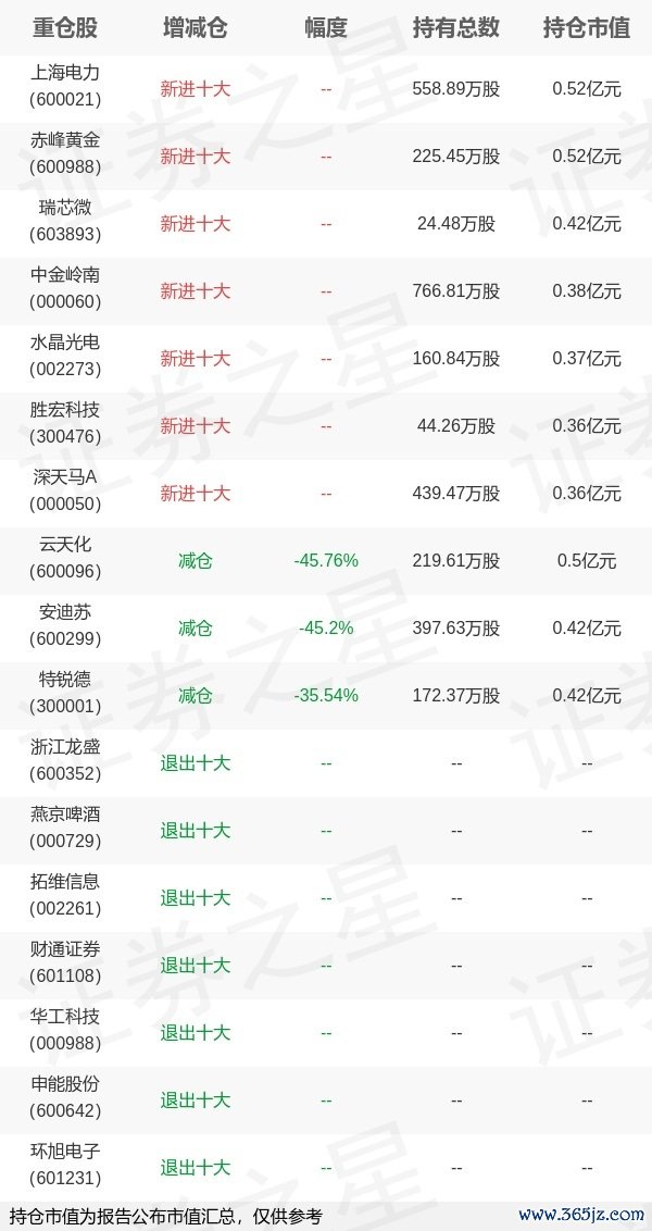 本站消息,4月22日富国基金旗下李笑薇 徐幼华 方旻管理的富国中证500指数增强型基金(LOF)公布一季报,近1年净值增长率2.16%。与上一季度相比,该基金前十大重仓股新增上海电力,赤峰黄金,瑞芯微,中金岭南,水晶光电,胜宏科技,深天马A;其中上海电力持仓占比0.87%,为该基金第一大重仓股;浙江龙盛,燕京啤酒国华通配资,拓维信息,财通证券,华工科技,申能股份,环旭电子等退出前十大重仓股;详细数据如下: