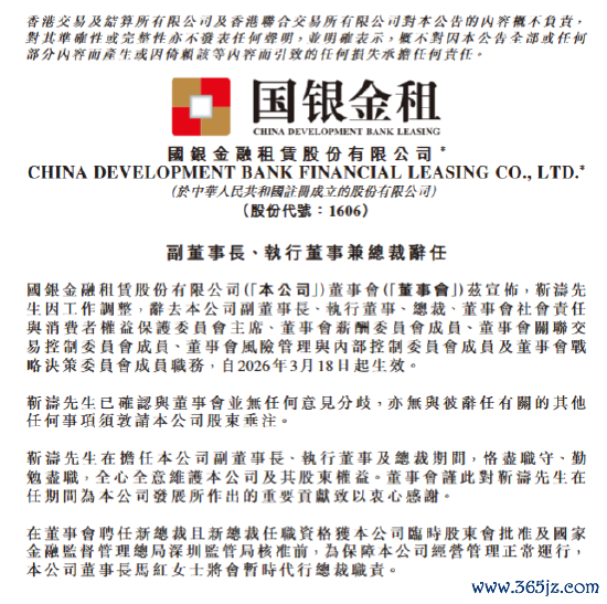 3月18日金融一线消息,国银金租今日发布公告称,靳涛因工作调整,辞去公司副董事长、执行董事、总裁、董事会社会责任与消费者权益保护委员会主席、董事会薪酬委员会成员、董事会关联交易控制委员会成员、董事会风险管理与内部控制委员会成员及董事会战略决策委员会成员职务,自2026年3月18日起生效。